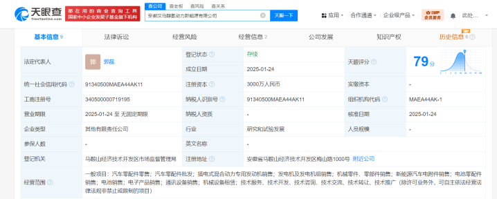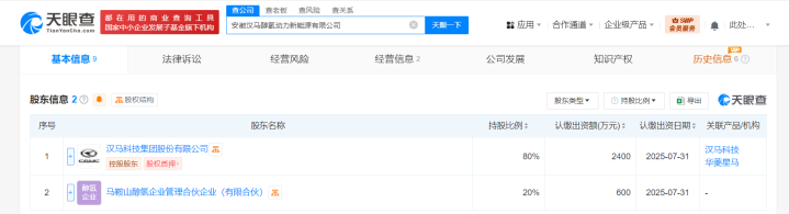每经AI快讯,天眼查App显示,近日,安徽汉马醇氢动力新能源有限公司成立,法定代表人为郭磊,注册资本3000万人民币,经营范围含汽车零配件零售、汽车零配件批发、插电式混合动力专用发动机销售、发电机及发电机组销售、新能源汽车电附件销售、电子产品销售等。股东信息显示,该公司由*ST汉马(600375)、马鞍山醇氢企业管理合伙企业(有限合伙)共同持股。
